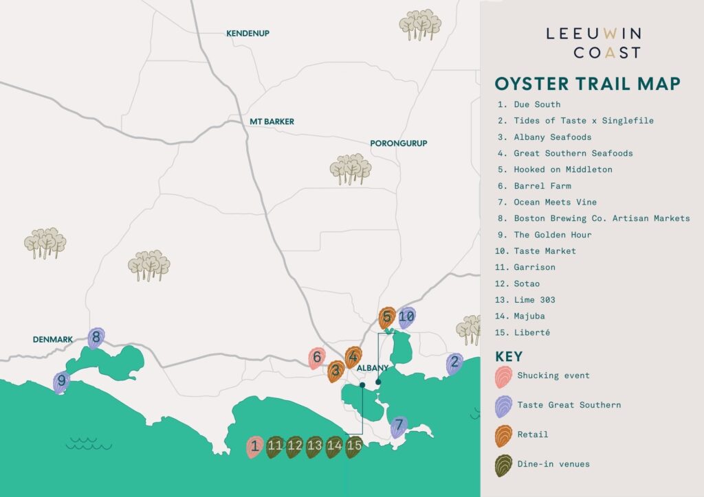 Wherever you are this Taste Great Southern, you can be sure to find fresh and local Leeuwin Coast Albany Rock Oysters at a variety of venues; from dine-in restaurants and bars, to markets or retailers to enjoy at home or at the beach. We’ve curated this Oyster Trail so you can easily seek out and get your fill throughout Taste Great Southern.